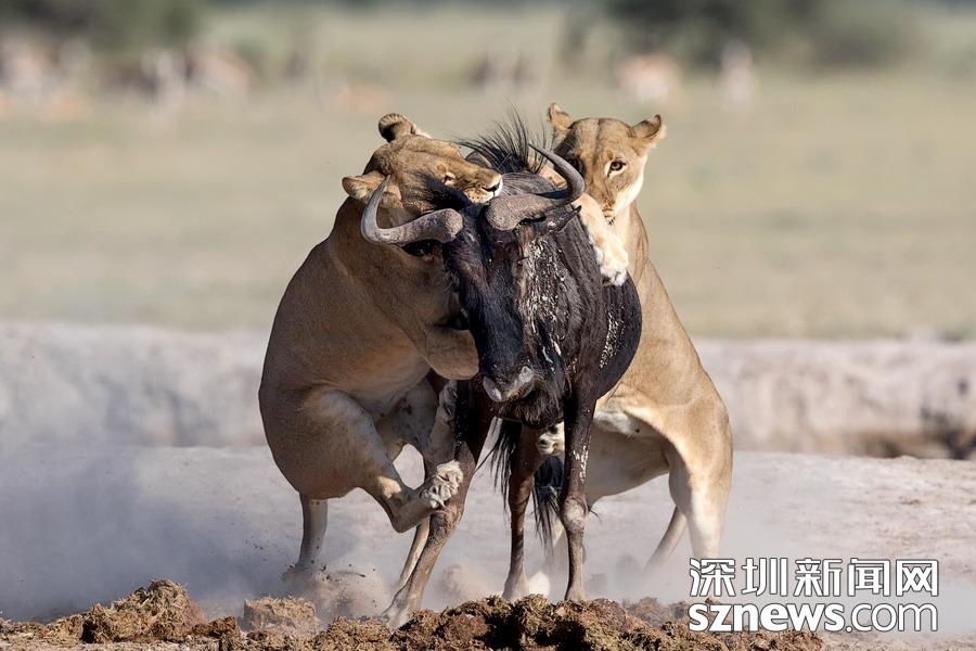 英國攝影師蘇-莫里斯(Sue Morri)在博茨瓦納Nxai Pan國家公園游玩,目睹了一場兇惡母獅獵食角馬的畫面。母獅甚至攀到了角馬背上,想要牢牢遏制住到手的“美餐”。強(qiáng)壯的角馬努力地與母獅抗?fàn)?,竭力想要保住自己的性命,但最終還是不敵母獅被拿下,最后成了母獅孩子們的盤中餐。