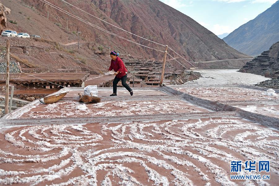 5月22日,西藏納西民族鄉(xiāng)加達村村民拉措在鹽田上收鹽。位于西藏昌都芒康縣瀾滄江畔的古鹽田,至今仍保持最原始的手工曬鹽方式。據(jù)史料記載,唐朝時期當?shù)鼐烷_始曬鹽。鹽田在瀾滄江兩岸依山而建,由多根木柱搭架,架上用透水性強的泥土鋪成平面夯實,當?shù)鼐用駨臑憸娼系柠}井、鹽池中取出鹵水倒入鹽田,經陽光蒸曬、風干,結晶成鹽。遠遠望去,鹽田錯落有致,田中鹵水宛若鏡面,形成壯麗奇觀。新華社記者李鑫 攝