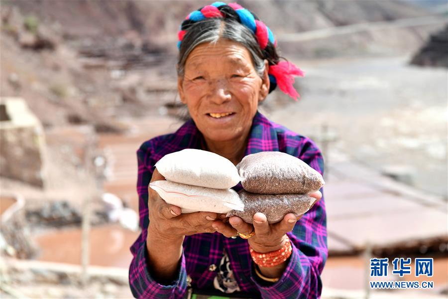 5月22日,西藏納西民族鄉(xiāng)加達村村民曲措展示所賣鹽類商品。位于西藏昌都芒康縣瀾滄江畔的古鹽田,至今仍保持最原始的手工曬鹽方式。據(jù)史料記載,唐朝時期當?shù)鼐烷_始曬鹽。鹽田在瀾滄江兩岸依山而建,由多根木柱搭架,架上用透水性強的泥土鋪成平面夯實,當?shù)鼐用駨臑憸娼系柠}井、鹽池中取出鹵水倒入鹽田,經陽光蒸曬、風干,結晶成鹽。遠遠望去,鹽田錯落有致,田中鹵水宛若鏡面,形成壯麗奇觀。新華社記者李鑫 攝