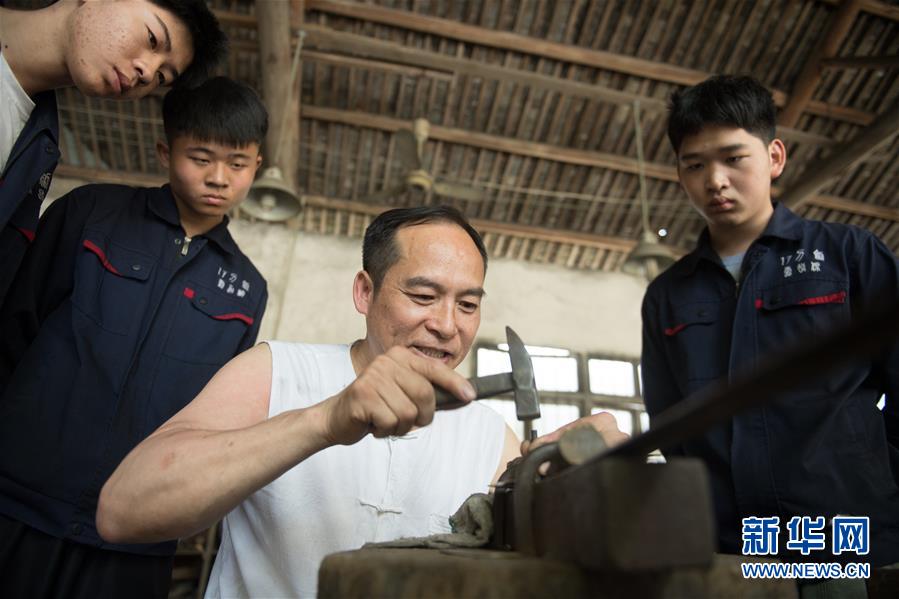 5月21日,鄭國榮在一把寶劍上鏨刻龍鳳紋,徒弟們在旁邊學(xué)習(xí)。 新華社記者 翁忻旸 攝