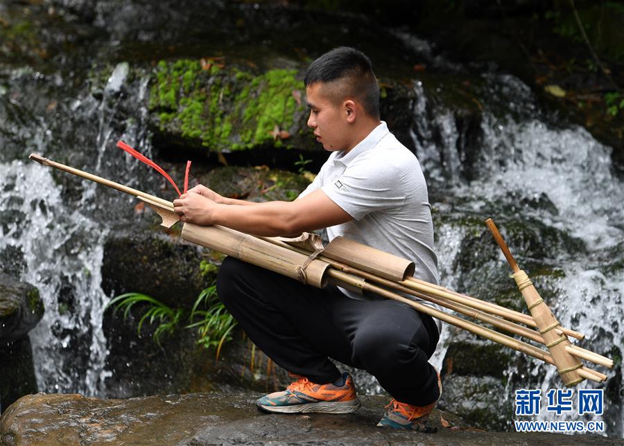 5月30日,在融水苗族自治縣安太鄉(xiāng)小桑村青山屯,杜信文在家門外調(diào)試一把剛剛制作完成的蘆笙。 新華社記者 陸波岸 攝