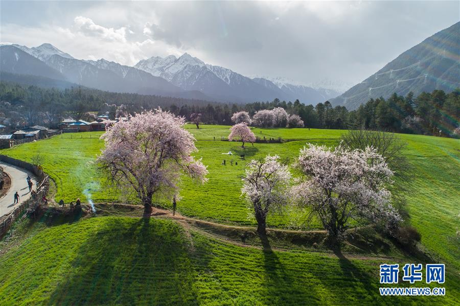 西藏林芝波密縣境內(nèi)桃花盛開的田園風(fēng)光(4月5日無人機(jī)拍攝)。