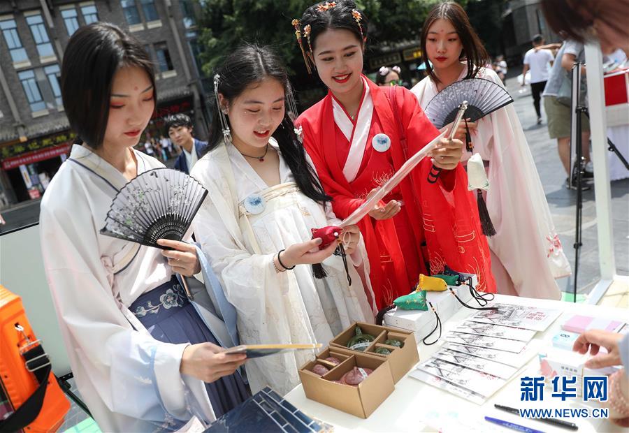 6月9日,在成都寬窄巷子,幾位漢服愛(ài)好者在香包、茶器等展臺(tái)駐足。新華社記者 江宏景 攝