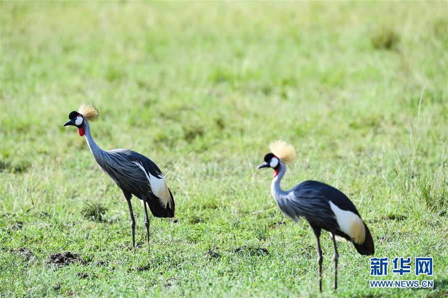 6月17日,在肯尼亞馬賽馬拉國(guó)家保護(hù)區(qū),兩只冕鶴在草原上覓食。 新華社記者 李琰 攝