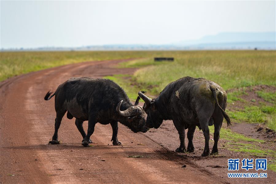 6月17日,在肯尼亞馬賽馬拉國(guó)家保護(hù)區(qū),兩頭水牛在打斗。 新華社記者 李琰 攝
