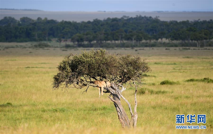 6月17日,在肯尼亞馬賽馬拉國(guó)家保護(hù)區(qū),一頭獅子在樹(shù)上休息。 新華社記者 李琰 攝