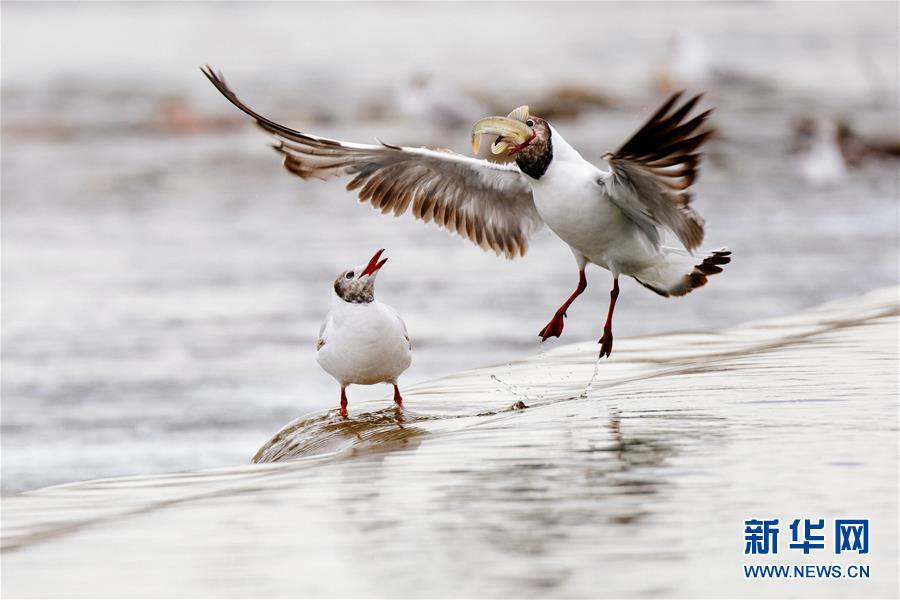 7月6日,在青海省剛察縣沙柳河里,一只棕頭鷗捕捉到一只躍起的湟魚。 新華社記者 劉金海攝