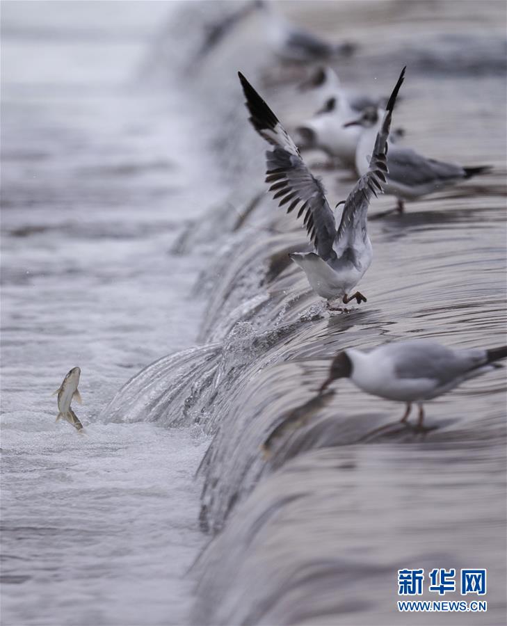 7月6日,在青海省剛察縣沙柳河里,幾只棕頭鷗等待捕捉躍起的湟魚(yú)。 新華社記者 費(fèi)茂華攝