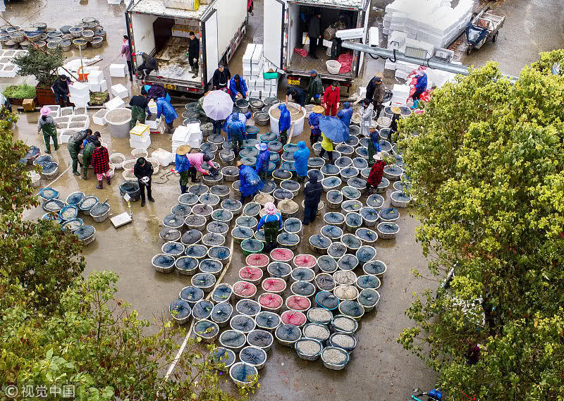 浙江臺(tái)州三門縣花橋鎮(zhèn)柵下村的文化禮堂前,村民們冒雨和商販交易蟶苗,現(xiàn)場(chǎng)一片繁忙。