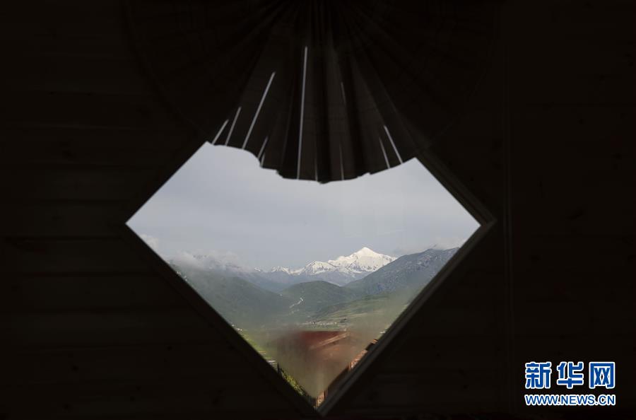 透過阿尼瑪卿雪山附近一個農(nóng)家樂的窗戶遙望阿尼瑪卿雪山(7月10日攝)。 新華社記者 費茂華 攝