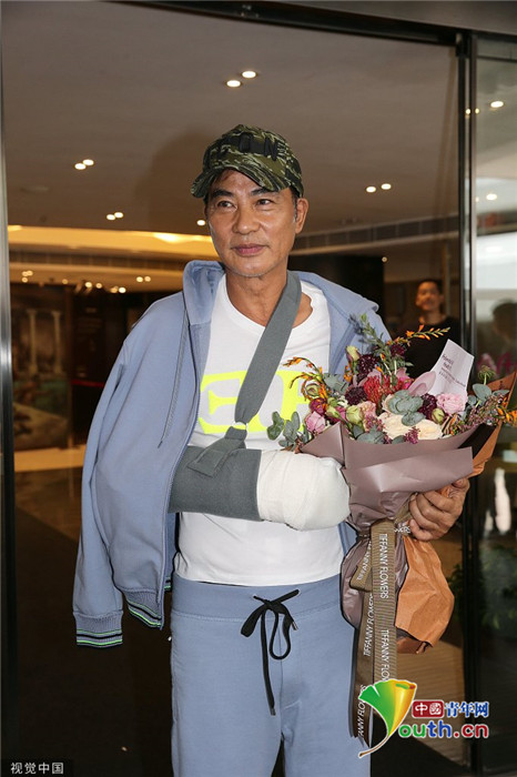2019年7月24日,香港,任達(dá)華出院。他身穿藍(lán)色運動外套走出醫(yī)院,頭戴鴨舌帽,受傷的右手則套上白色護(hù)臂帶,面帶笑容,精神狀態(tài)非常好。