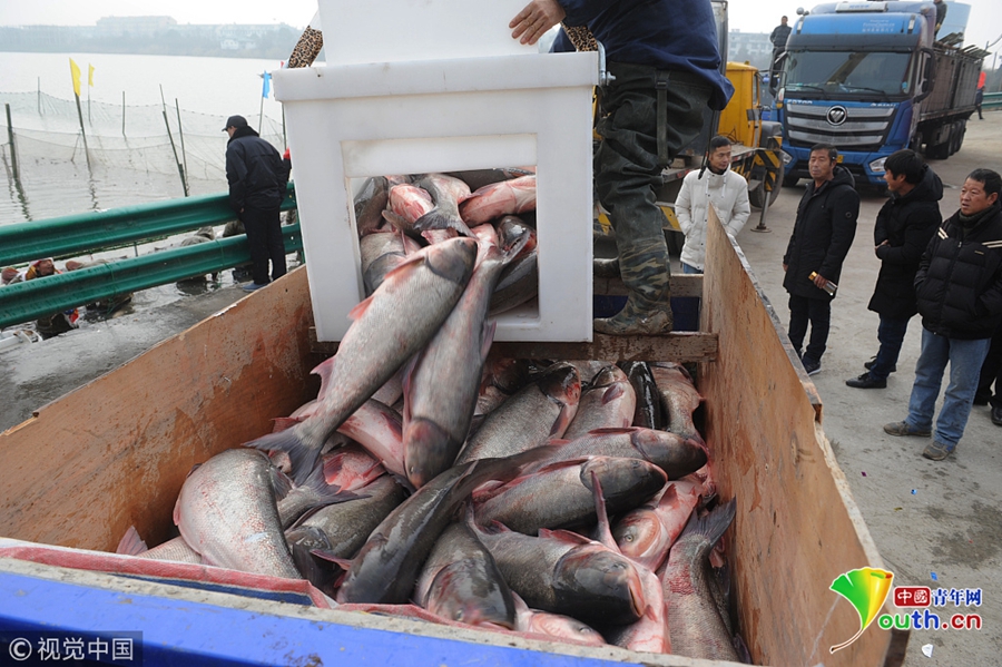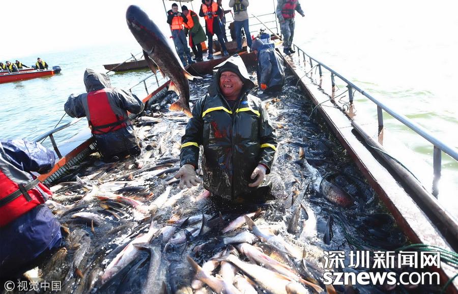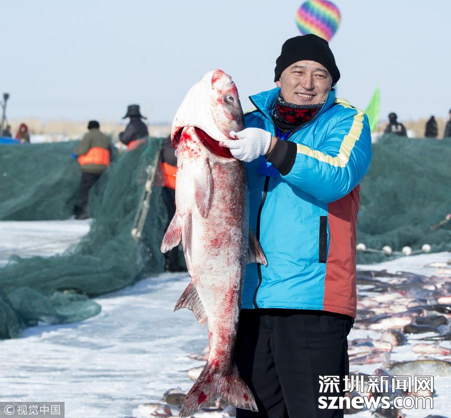 2018年12月26日,吉林松原,查干湖迎來了“紅網(wǎng)”,單網(wǎng)捕撈約30萬斤。