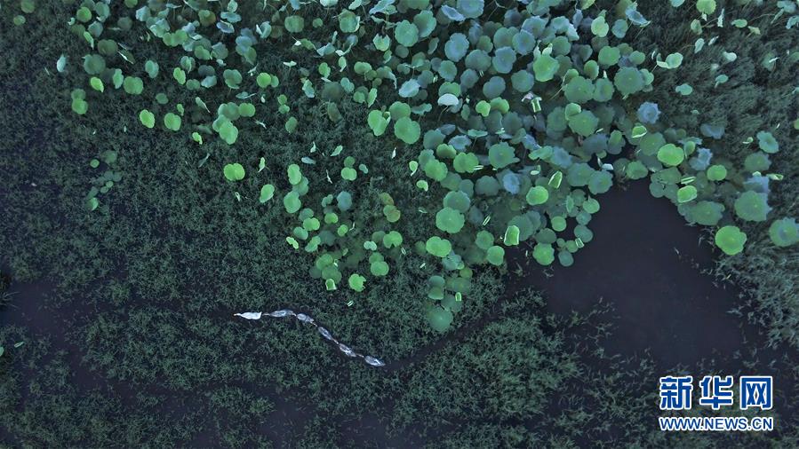 這是8月4日無人機拍攝的安徽黟縣宏村風景區(qū)附近的荷塘。新華社記者 張端 攝