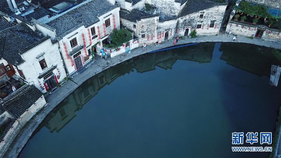 這是8月4日無人機拍攝的安徽黟縣宏村風景區(qū)月沼晨景。新華社記者 張端 攝