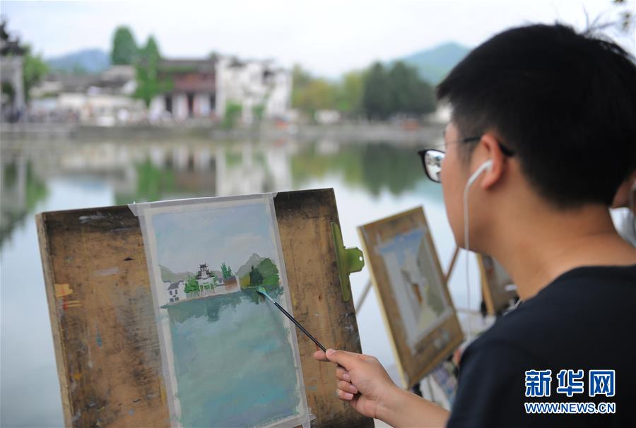 4月24日,繪畫愛好者在宏村風景區(qū)寫生。近日,隨著氣溫升高,位于安徽省黟縣的古村落西遞和宏村春意盎然,景色如畫。大批繪畫愛好者前來寫生,用畫筆描繪古村春色。 新華社記者 任鵬飛 攝