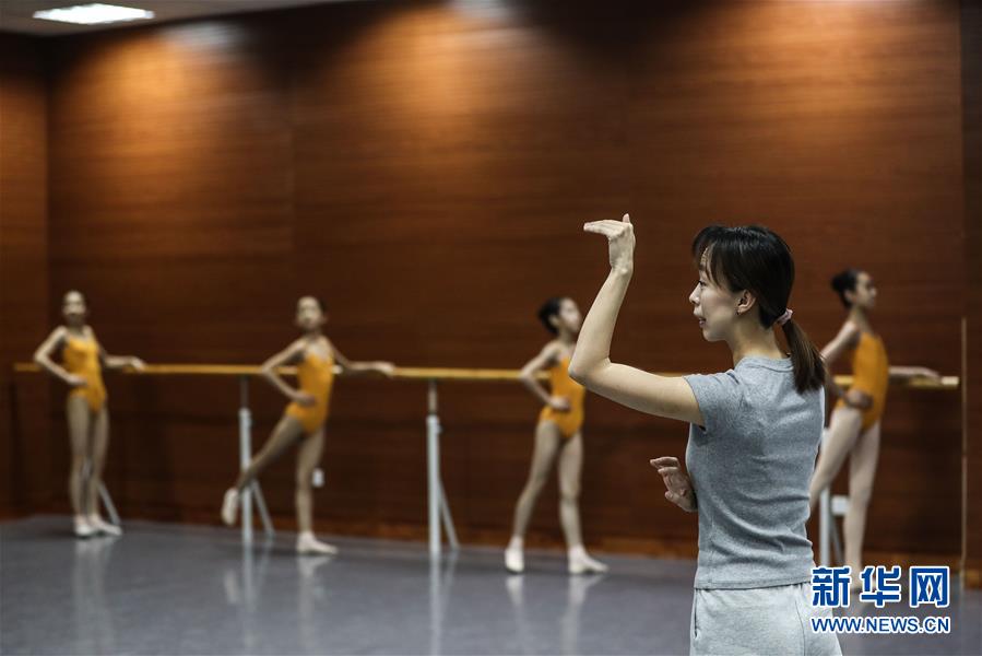 4月12日,遼寧芭蕾舞團(tuán)附屬芭蕾舞蹈學(xué)校的老師張夢(mèng)妮在為一年級(jí)的學(xué)生上芭蕾基訓(xùn)課。新華社記者 潘昱龍 攝