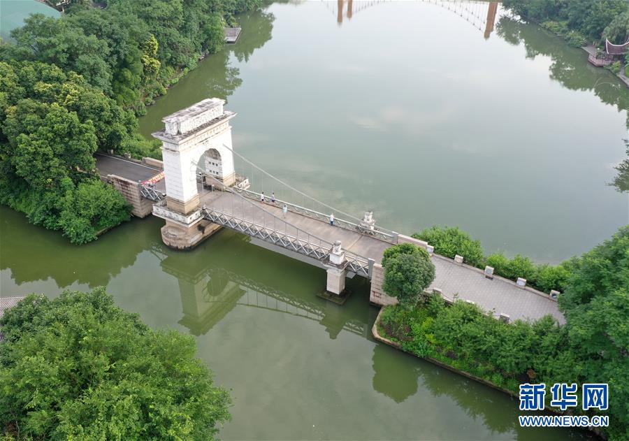 桂林市榕湖上的橋梁(7月1日無人機拍攝)。 夏日時節(jié),廣西桂林市區(qū)內的榕湖、杉湖、桂湖、木龍湖等地綠樹成蔭、景色迷人。 新華社記者陸波岸攝