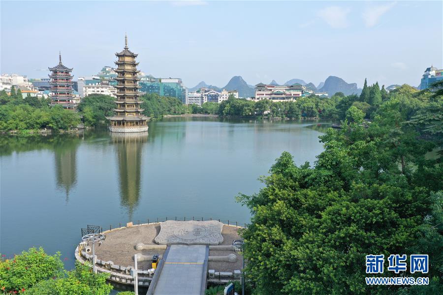 桂林市杉湖景觀(7月1日無人機拍攝)。 夏日時節(jié),廣西桂林市區(qū)內的榕湖、杉湖、桂湖、木龍湖等地綠樹成蔭、景色迷人。 新華社記者陸波岸攝