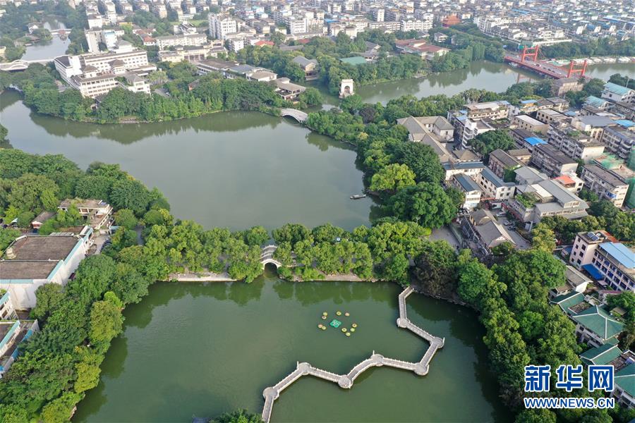 桂林市榕湖附近景觀(7月1日無(wú)人機(jī)拍攝)。 夏日時(shí)節(jié),廣西桂林市區(qū)內(nèi)的榕湖、杉湖、桂湖、木龍湖等地綠樹(shù)成蔭、景色迷人。 新華社記者陸波岸攝