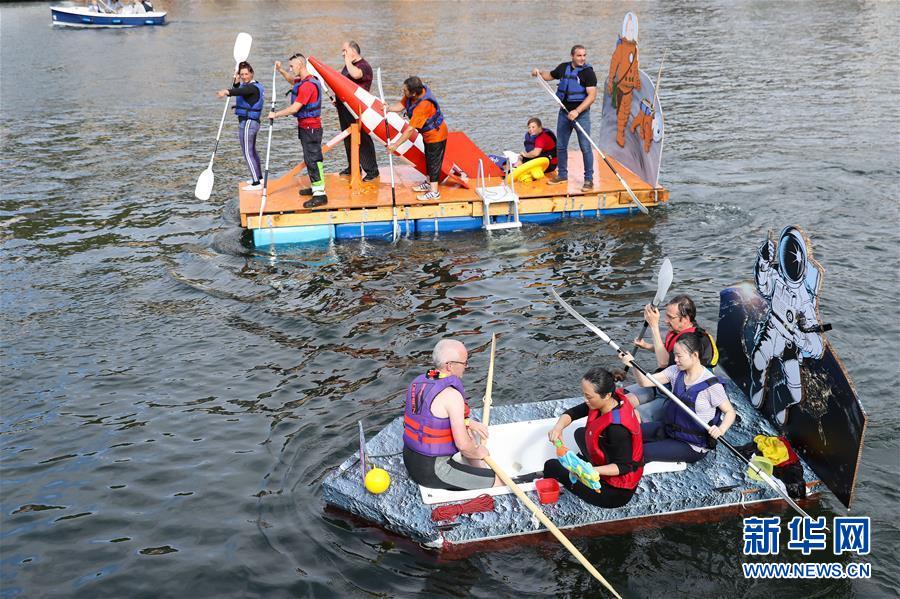 8月15日,在比利時(shí)南部小城迪南的默茲河上,人們參加“浴缸劃船節(jié)”的表演。新華社記者 張鋮 攝