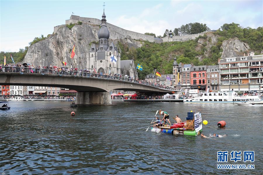 8月15日,在比利時南部小城迪南的默茲河上,人們參加“浴缸劃船節(jié)”的表演。新華社記者 張鋮 攝