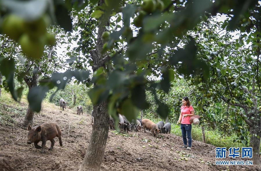 8月20日,康丹丹在果園內(nèi)喂豬吃蘋果梨。新華社記者 王昊飛 攝