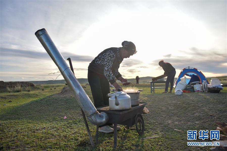 在新疆阿勒泰地區(qū)福??h,牧民在轉(zhuǎn)場途中生火做飯(6月5日攝)。新華社記者丁磊攝