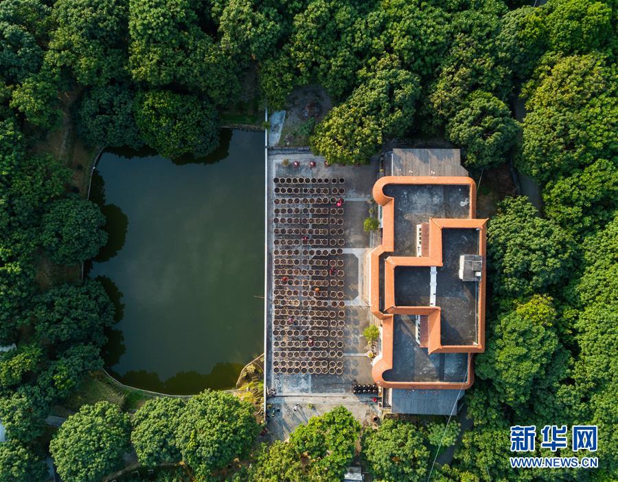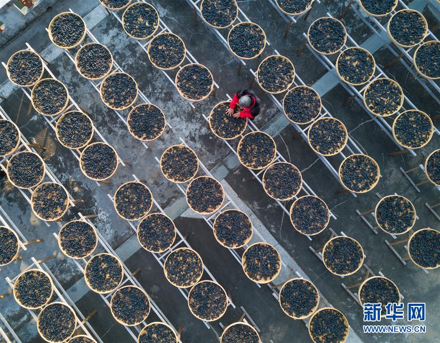 在福建省永春縣岵山鎮(zhèn)茂霞村熟地文創(chuàng)園,村民在晾曬用當(dāng)?shù)貍鹘y(tǒng)手藝制作的藥材——熟地(1月28日無人機(jī)拍攝)。  新華社記者 宋為偉 攝