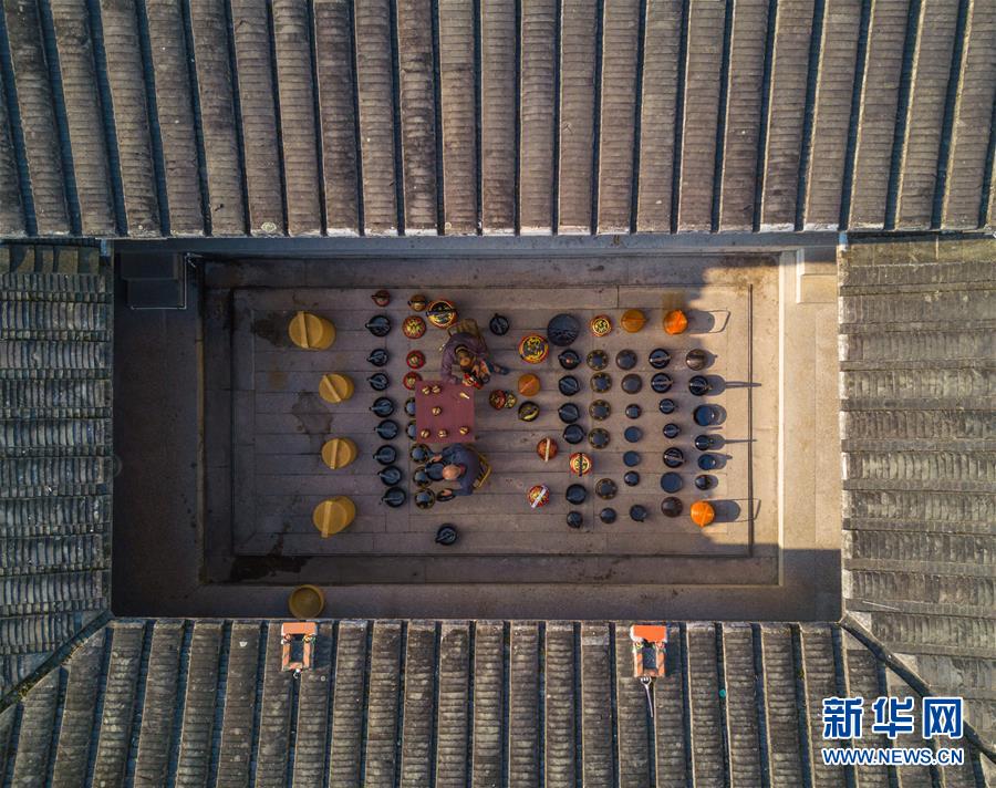 在福建省永春縣仙夾鎮(zhèn)龍水村,村民在老宅制作當(dāng)?shù)靥厣峄@(1月28日無人機(jī)拍攝)。 新華社記者 宋為偉 攝