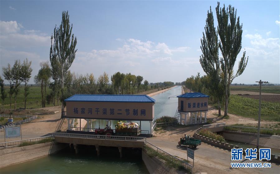 9月4日無人機(jī)拍攝的河套灌區(qū)楊家河干渠第二節(jié)制閘。 新華社記者 劉詩(shī)平 攝