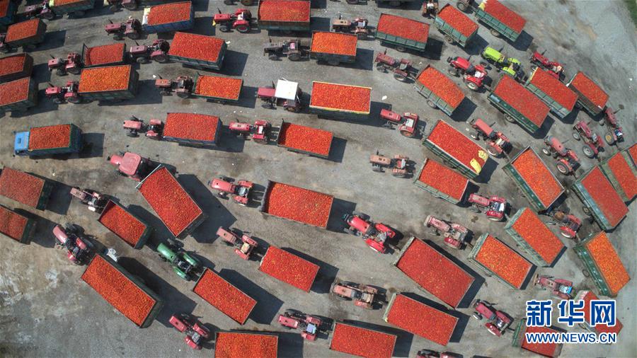 9月4日無人機(jī)拍攝的河套灌區(qū)三道橋鎮(zhèn)農(nóng)民向本地蔬菜加工廠排隊(duì)出售番茄。 新華社記者 劉詩平 攝