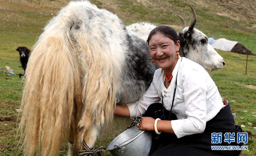 在青海省玉樹(shù)藏族自治州治多縣治渠鄉(xiāng)同卡村,村民昂文西讓的妻子布沙措江卓瑪正在擠牛奶(9月12日攝)。新華社記者 韓方方 攝