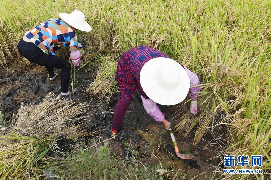 9月15日,云南尋甸回族彝族自治縣七星鎮(zhèn)魯古村的農(nóng)婦在參加割稻谷比賽。 新華社記者 楊宗友 攝