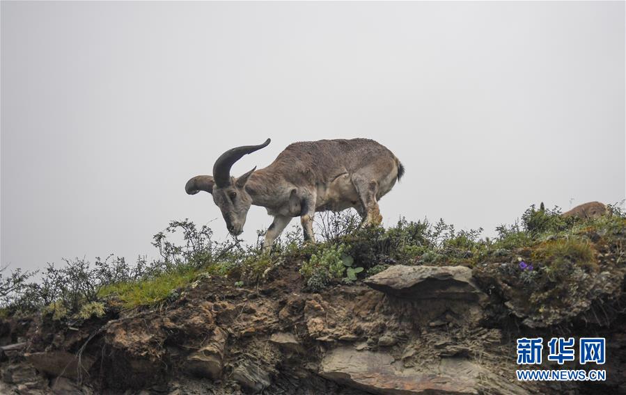 一只巖羊在西藏山南市洛扎縣色鄉(xiāng)海拔4000米左右的盤山路邊,悠閑地吃著野果青草(9月22日攝)。 新華社記者 晉美多吉 攝