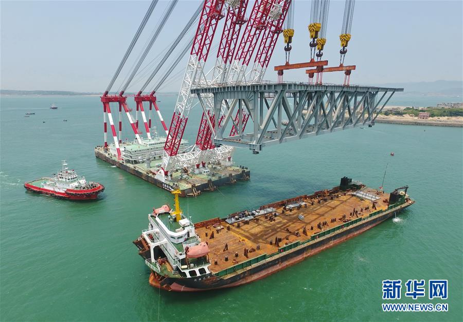 5月12日,“大橋海鷗號”起重船在吊裝一孔簡支鋼桁梁(無人機拍攝)。新華社記者林善傳攝