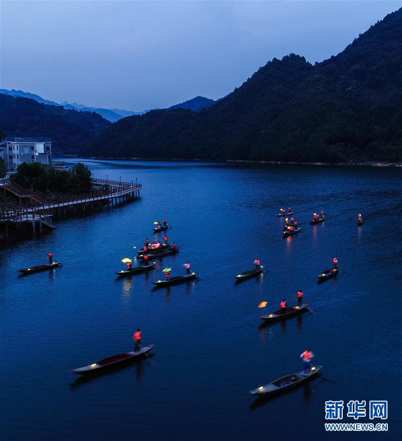 9月25日,在宋村鄉(xiāng)云源港的水面上,漁民劃著漁船,船頭點亮漁燈,構(gòu)成一幅“漁舟唱晚、萬家燈火”的美麗圖景(無人機拍攝)。 新華社記者 徐昱 攝