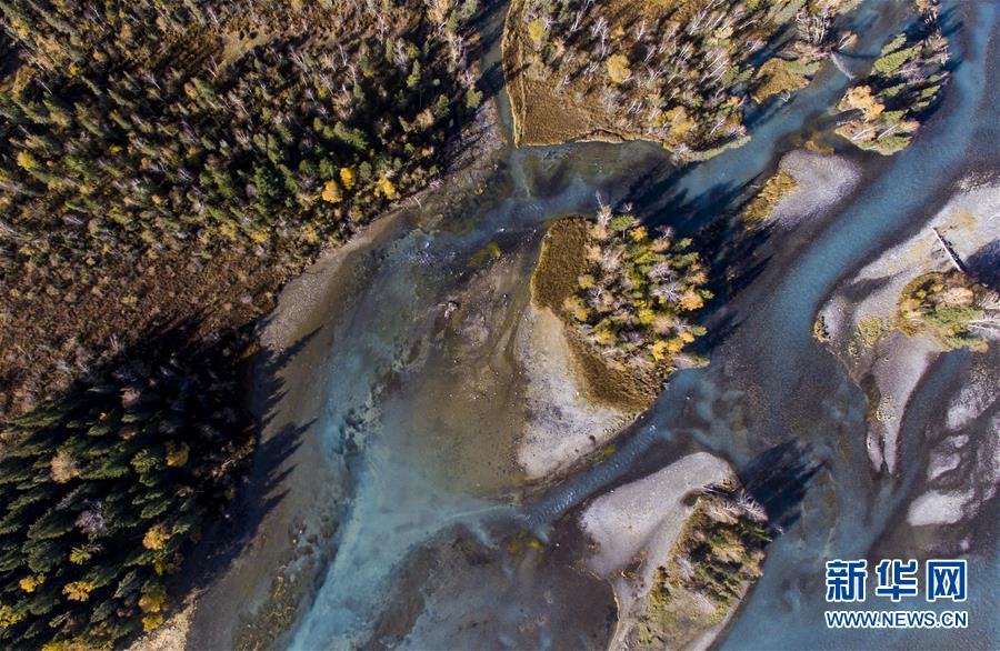 9月25日無人機(jī)拍攝的喀納斯景區(qū)風(fēng)光。 新華社記者 王菲 攝