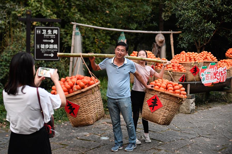10月3日,游客在西溪國(guó)家濕地公園挑起道具“柿子”留影。據(jù)了解,西溪濕地內(nèi)共有柿子樹7000多棵,正值豐收的季節(jié)。 當(dāng)日是國(guó)慶假期第三天,大批游客來到位于杭州的西溪國(guó)家濕地公園游玩,在江南詩(shī)意的環(huán)境中休閑度假。 新華社記者 黃宗治 攝