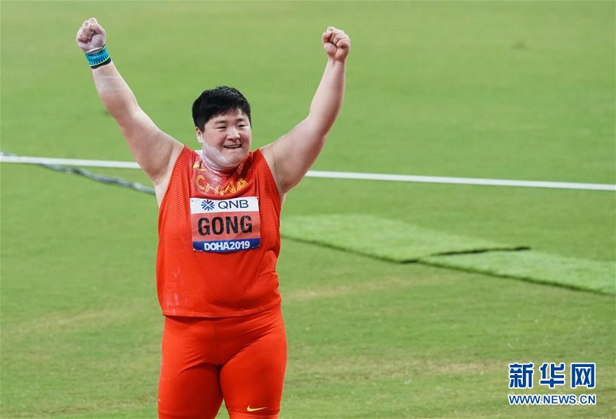 當日,在卡塔爾多哈舉行的2019國際田聯(lián)世界田徑錦標賽女子鉛球決賽中,衛(wèi)冕冠軍、中國選手鞏立姣以19米55的成績奪得冠軍。 新華社記者王麗莉攝