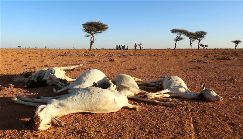 當(dāng)?shù)貢r(shí)間2016年12月15日,索馬里邦特蘭,干旱的土地上散布著羊的尸體。當(dāng)?shù)卦庥龈珊堤鞖?,牲畜受到危害?br>