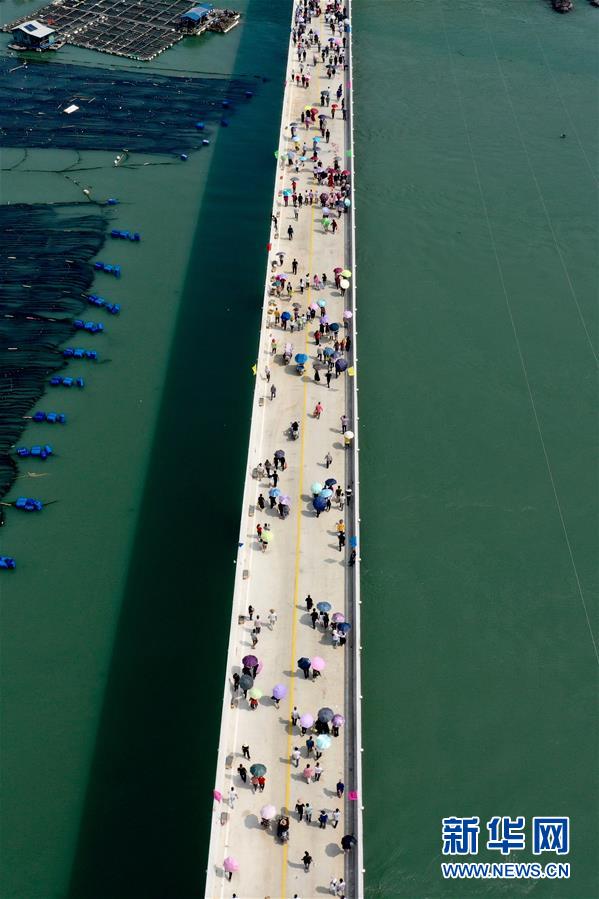 10月12日,福建省霞浦縣東安島海防大橋正式通車,這是當(dāng)?shù)厝罕娮咴谛聵蛏希o人機(jī)拍攝)。新華社記者姜克紅攝