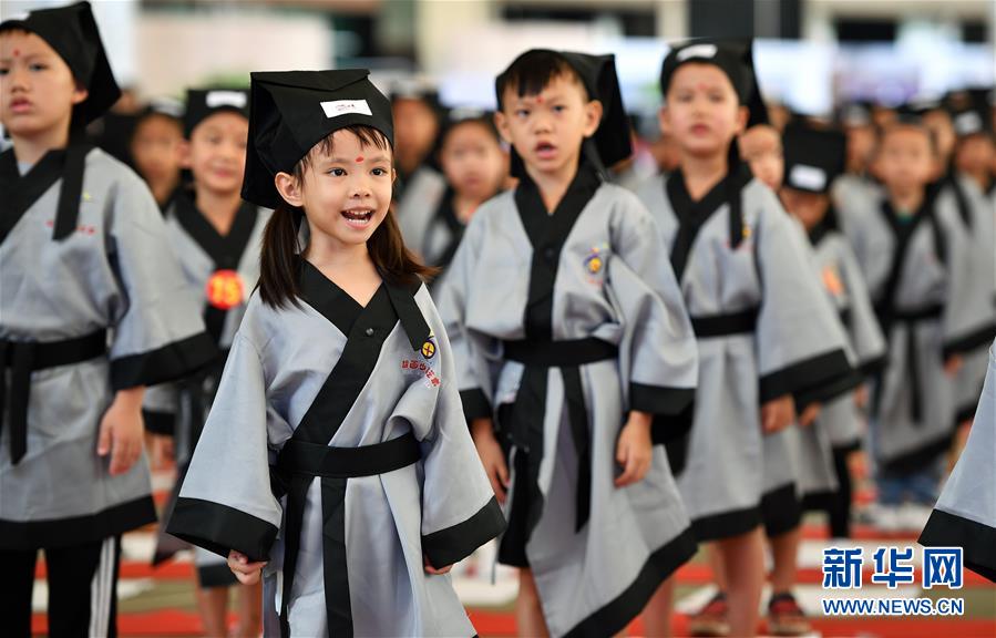 10月13日,參加儀式的小朋友在誦讀《三字經(jīng)》。當(dāng)日,??诤嬌賰核囆g(shù)中心為500名小朋友舉行“開筆禮”,通過(guò)“點(diǎn)朱砂,啟智慧”“習(xí)書法,描人字”等儀式讓孩子們體驗(yàn)中國(guó)傳統(tǒng)文化。新華社記者郭程攝