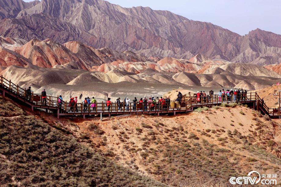 央視網(wǎng)消息:2019年10月15日,金秋時(shí)節(jié),位于甘肅省張掖市臨澤縣的七彩丹霞景區(qū)進(jìn)入旅游旺季,吸引眾多游人紛至沓來(lái)。張掖七彩丹霞景區(qū),分布面積約50公里,是中國(guó)北方干旱地區(qū)發(fā)育最典型的丹霞地貌。在方圓數(shù)十平方公里的范圍內(nèi),隨處可見(jiàn)有紅、黃、橙、綠、白等多種鮮艷的色塊或線條,把一座座山峰,一條條溝壑,裝點(diǎn)成一幅幅絢麗多姿、燦爛奪目的畫(huà)圖。圖片來(lái)源:視覺(jué)中國(guó)