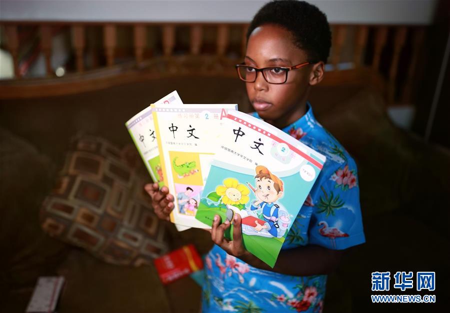9月25日,在美國(guó)芝加哥,卡亞·恩朱比展示漢語課本。 新華社記者 汪平 攝
