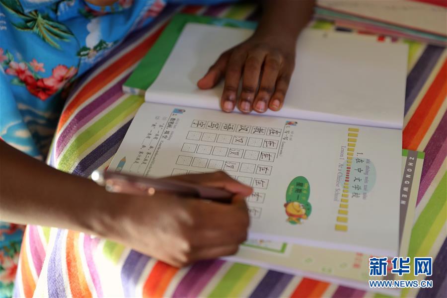9月25日,在美國芝加哥,卡亞·恩朱比練習(xí)寫漢字。 新華社記者 汪平 攝