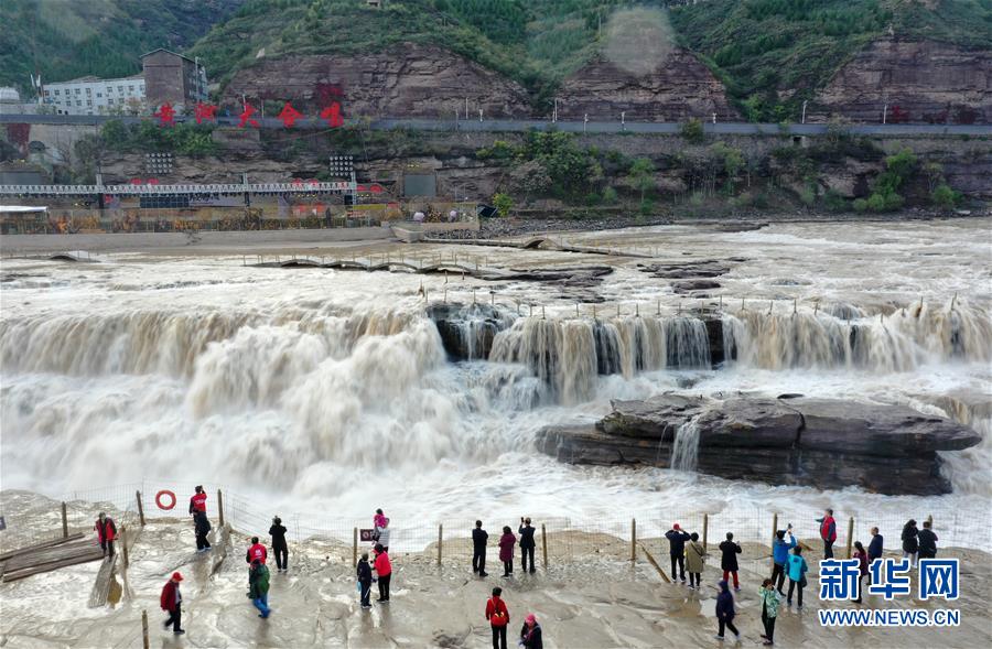 受近日降雨影響,位于山西吉縣的壺口瀑布水量增大,壯美的瀑布群景觀吸引眾多游客前來(lái)觀賞。新華社記者楊晨光攝