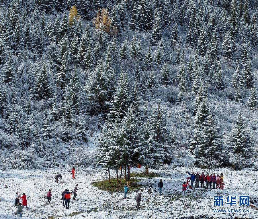 10月17日,在川藏線(xiàn)高爾寺山至理塘路段,部分游客在一個(gè)路邊觀(guān)景臺(tái)附近拍照留念。當(dāng)日,一場(chǎng)夜雪后,川藏線(xiàn)高爾寺山至理塘路段披上了一層銀裝。雪山、牦牛、云朵、松林,帶來(lái)了濃濃的雪域風(fēng)情。 新華社記者 王迪 攝