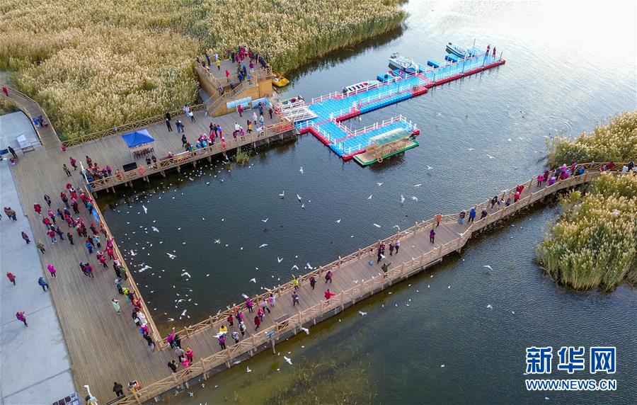 10月17日,游客在居延海岸邊的木棧道上給水鳥喂食。 新華社記者 彭源 攝