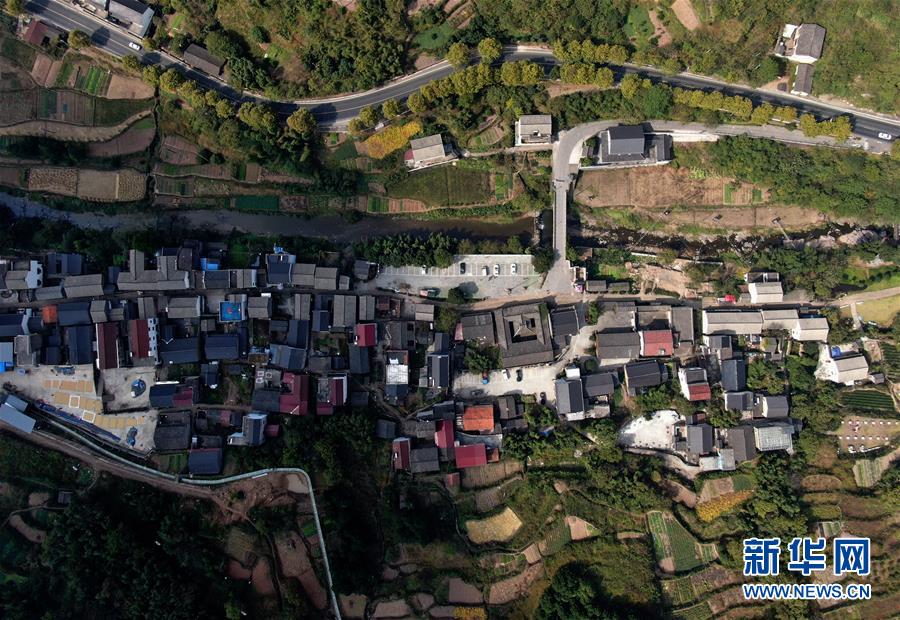 10月24日無人機(jī)拍攝的班竹村。浙江省新昌縣境內(nèi)的班竹村位于天姥山腳下,被稱為“天姥門戶”,曾是浙東“唐詩之路”上的驛站。近年來,班竹村依托深厚的文化底蘊(yùn)大力發(fā)展鄉(xiāng)村旅游,全村“人人參股、戶戶分紅”,將整個(gè)村莊打造為旅游綜合體,今年以來班竹村旅游收入已超過800萬元。新華社記者韓傳號(hào)攝