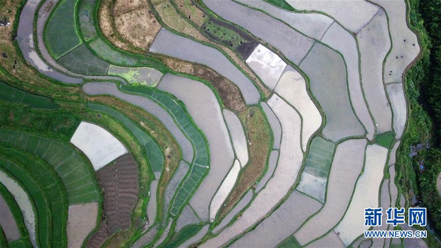 5月18日,農(nóng)民在貴州省丹寨縣龍泉鎮(zhèn)高要梯田里耕作(無(wú)人機(jī)拍攝)。初夏時(shí)節(jié),位于貴州省丹寨縣龍泉鎮(zhèn)的高要梯田景色優(yōu)美。新華社記者楊文斌攝